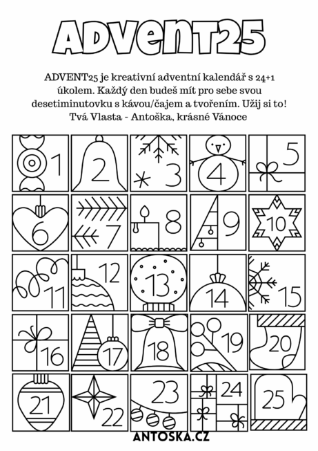 ADVENT25 je kreativní adventní kalendář s 24+1 úkolem. Každý den budeš mít pro sebe svou desetiminutovku s kávou/čajem a tvořením. Úkoly kreativní a protistresové. Je to takové wellness pro duši nebo lázně v hlavě. Není důležitý výsledek, ale cesta. Jde o aktivní relax a odbourání stresu, zejména v tomto období. Kreativní úkoly budou tvořivé, kreslící, psaní, arteterapeutické. Uvidíš, budou tě bavit. Budeš potřebovat pouze pastelky a tužku. A buď čistý papír nebo si PDF Advent25 můžeš vytisknout. Užij si to!