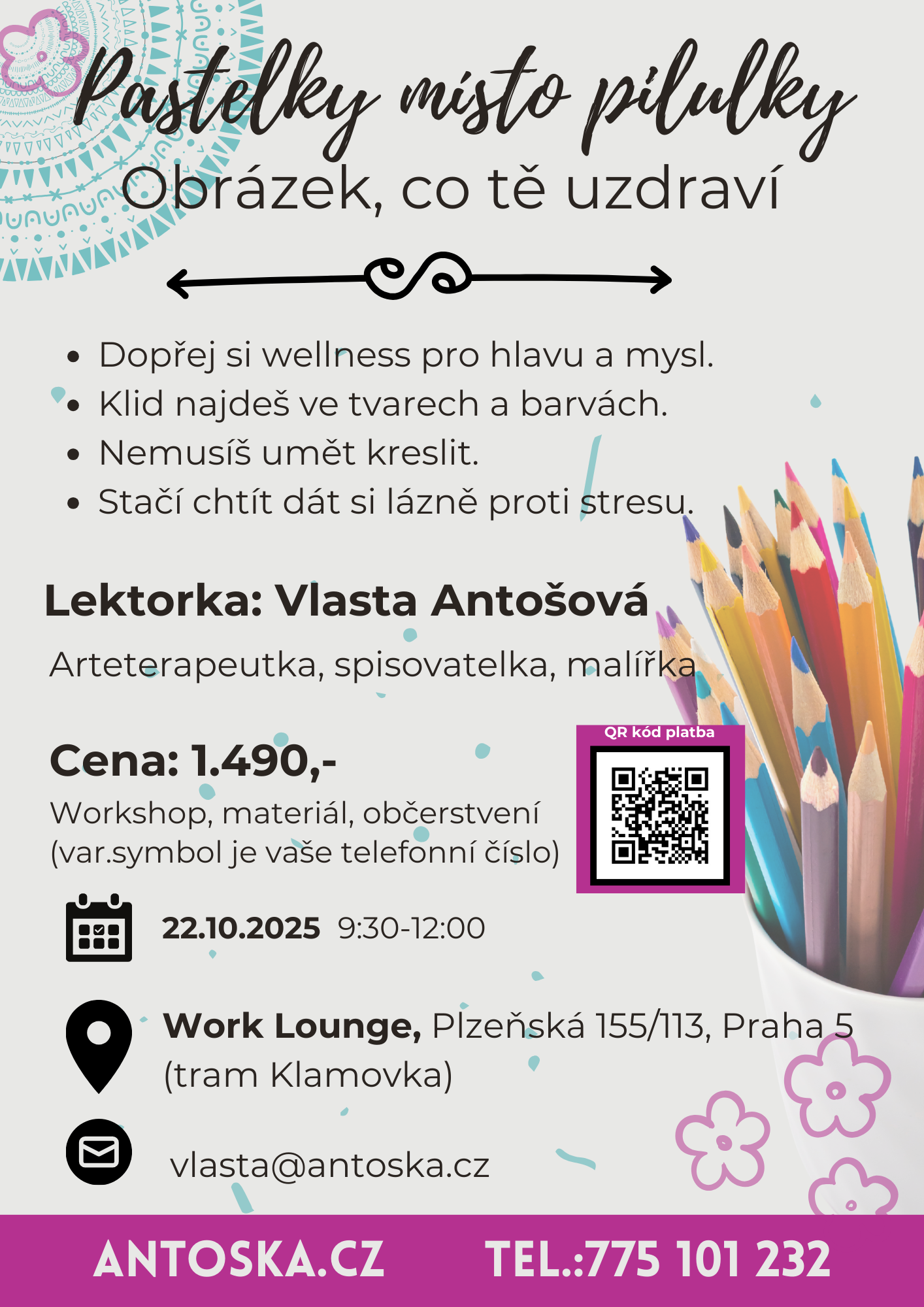 První workshop bude už 22.10.2025 ve Work Lounge Praha 5. Přihlašte se, přijďte a užijte si to. Garantuji vám absolutní relax s pastelkou v ruce. Budeme se věnovat tomu, co vás bude v tu chvíli tížit. A myslím si, že to bude stres.